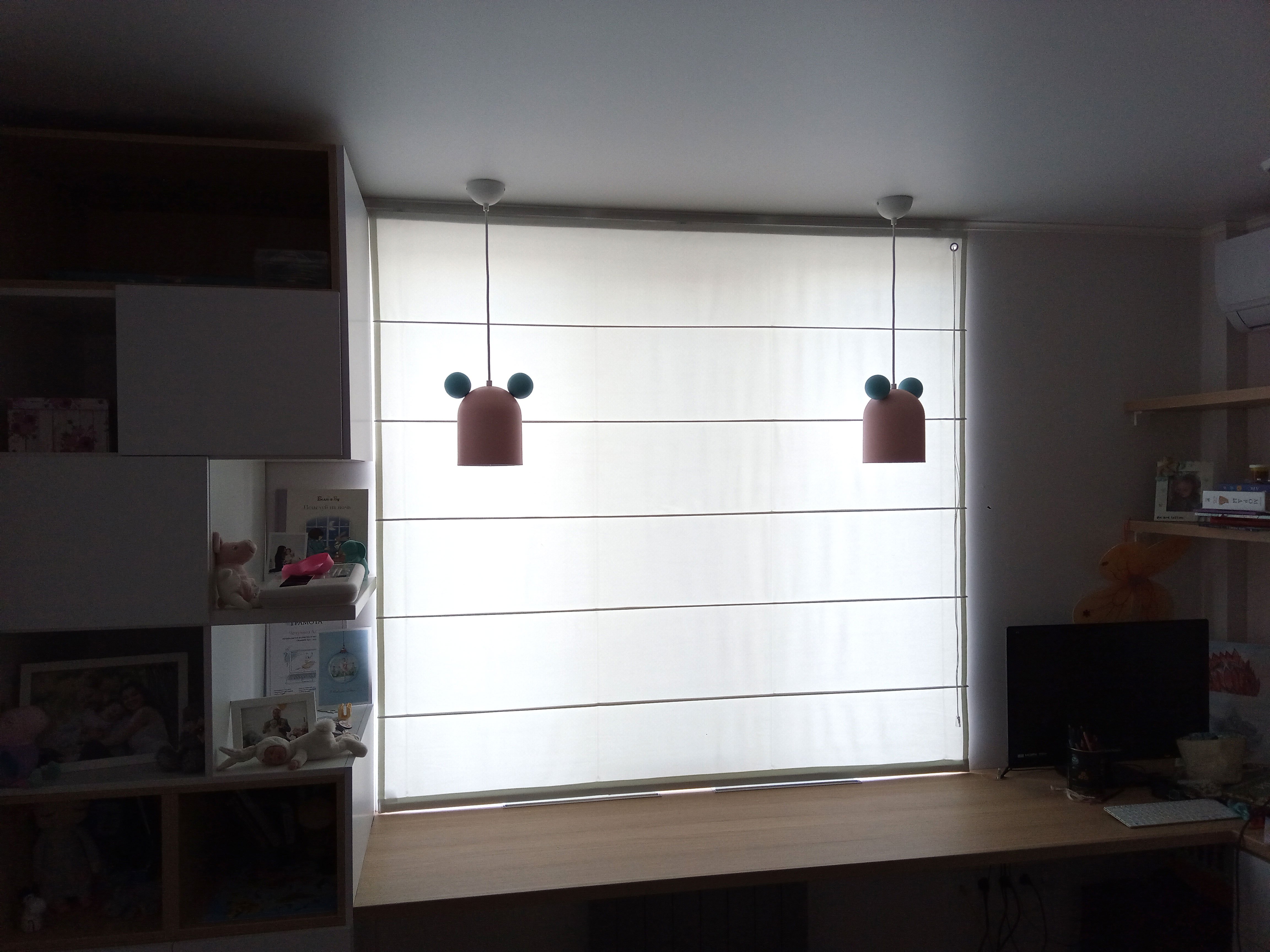 - Компактность. Римские шторы не загромождают подоконник, оставляя его свободным, и не перекрывают подход к нему.